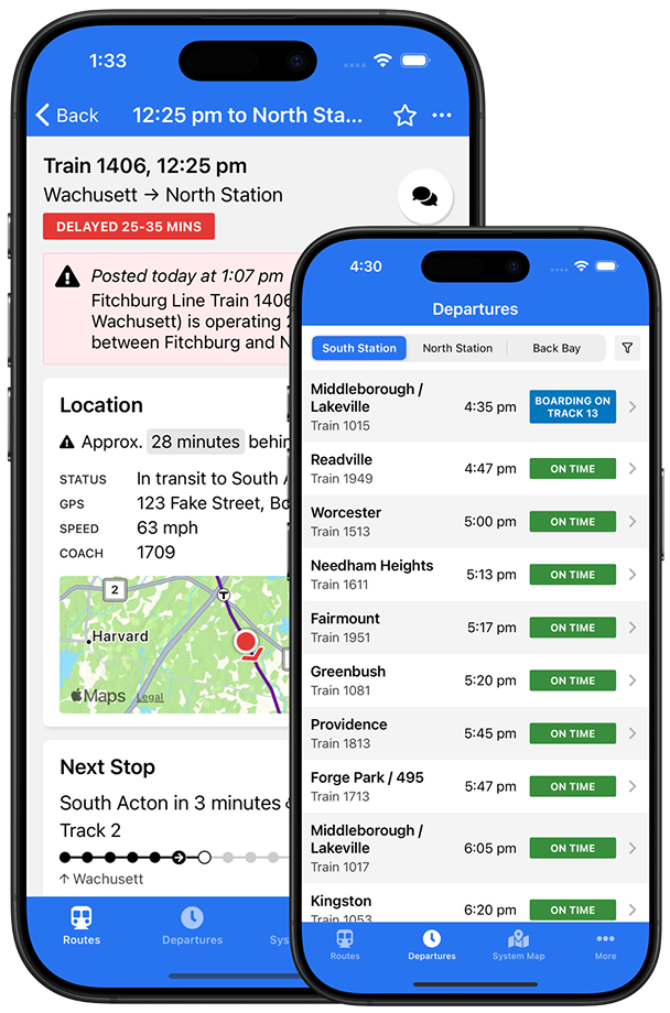 Boarding track numbers display next to each trip originating from North and South Station. Also view a dedicated departures screen to see the entire departures board.